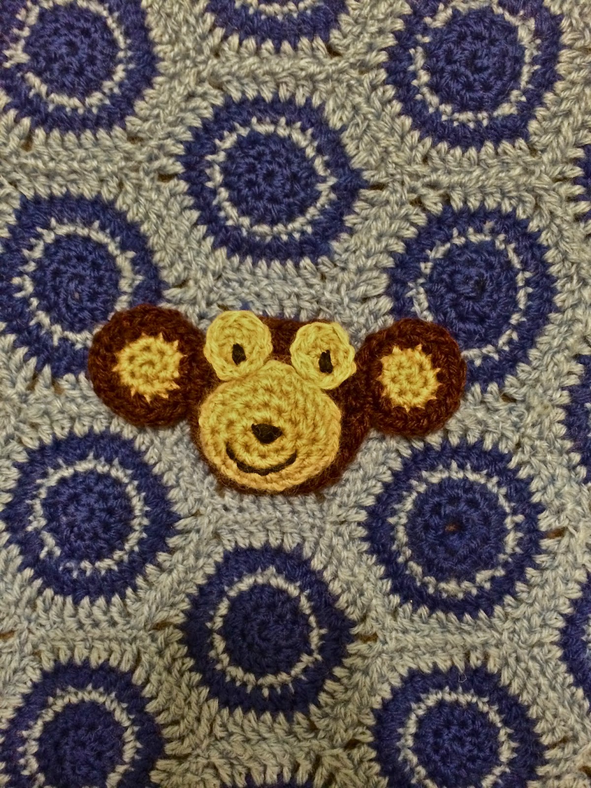 because of time constraints, i chose to omit most of the monkeys, personally i like it more with just one. i put them on opposite sides so my cousin knows which blanket belongs to which of her sons.